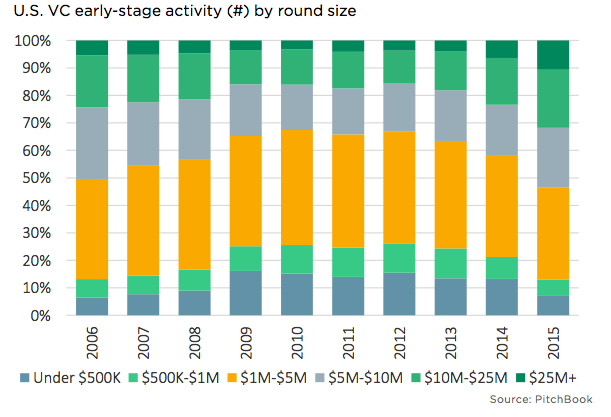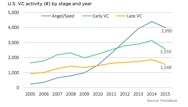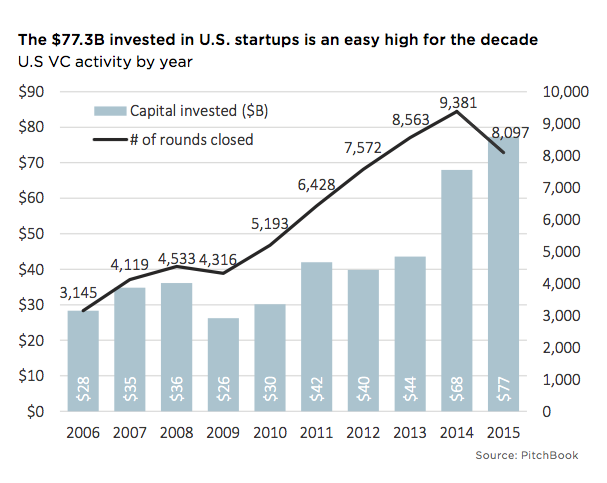 В 2015 на американском рынке венчурных сделок закрыто на $77,38 млрд. Это на $10 млрд больше чем в 2014.