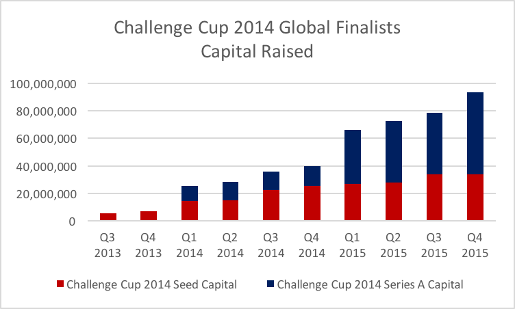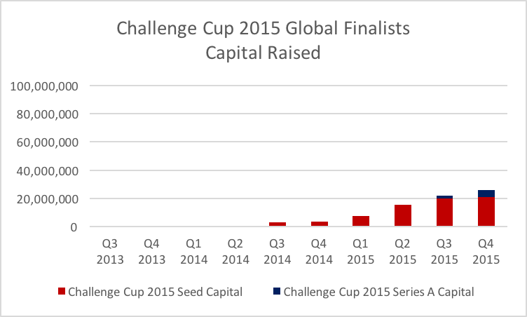As Challenge Cup 2015 is more recent, the global finalists are just starting to raise Series A capital. Of the 35 who have raised significant seed capital, two have raised Series A financing, totaling $5.2 million. One of those startups is based in New York City, U.S. and the other in Dublin, Ireland.