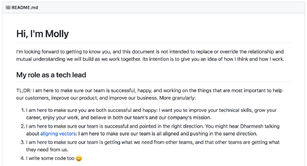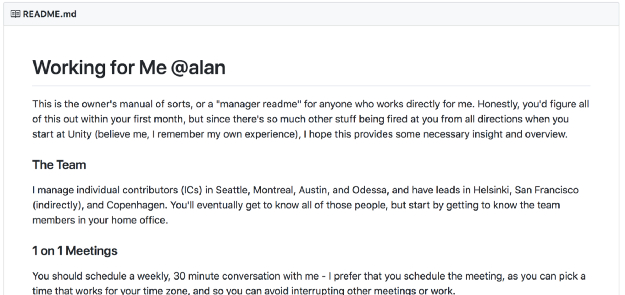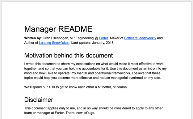Roy’s first README was built at Netflix. I think it’s great to see how Roy’s document has changed between two companies. It’s a great reminder that a manager adapts to the environment they are in.