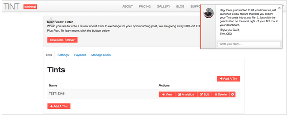Tint uses intercom for “Churn, Retention and Re-Engaging Customers.” One of our current challenges is to increase our monthly recurring revenue. And to reduce our churn, we want to make sure we talk with our customers so they know we’re here to help and are up to date with new features, blog posts, etc. Intercom makes this SUPER easy by allowing us to communicate with our customers when they are in the Tint app. This is smart because this is when they are focused on our app and willing to chat with us. We are still learning to use Intercom effectively to create strong relationships with visitors and customers alike through automated messaging to scale our touchpoint communications.