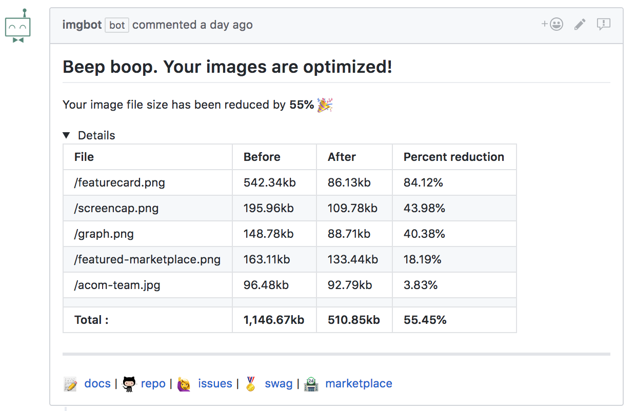 ImgBot — Crawls all the image files in the repository and sends a pull request after performing a lossless compression.
