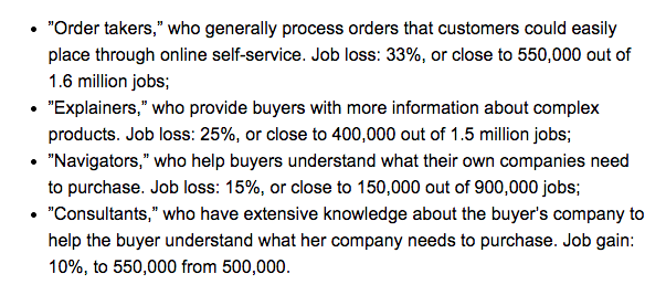 Forrester says the biggest impact will be on sales reps at wholesalers and distributors, but less so in such industries as high-tech manufacturers and providers of healthcare technology.