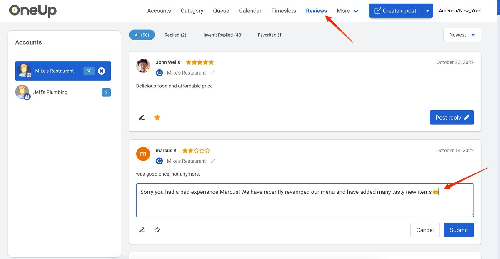 You can manage your customer reviews by going to the Reviews section in Google My Business.