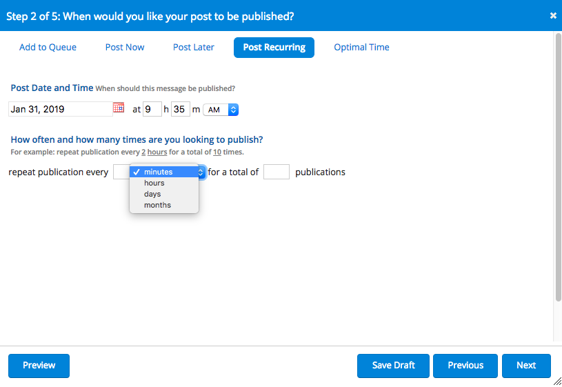 With Social Report, you can choose how often you would like your post to be repeated, choosing from an interval of minutes, hours, days, or weeks.