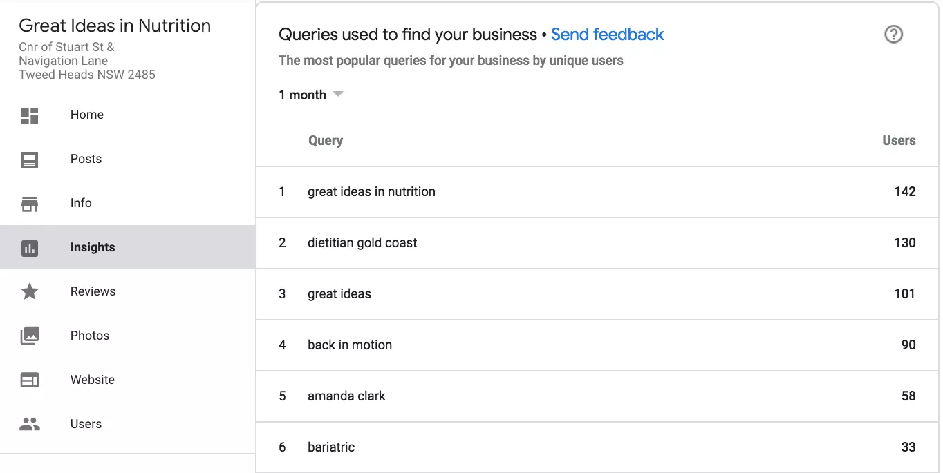 Additionally, Google My Business shows the queries that people used to find your business on both search and maps, an extremely valuable insight. Queries can be filtered by the last week, month or quarter.