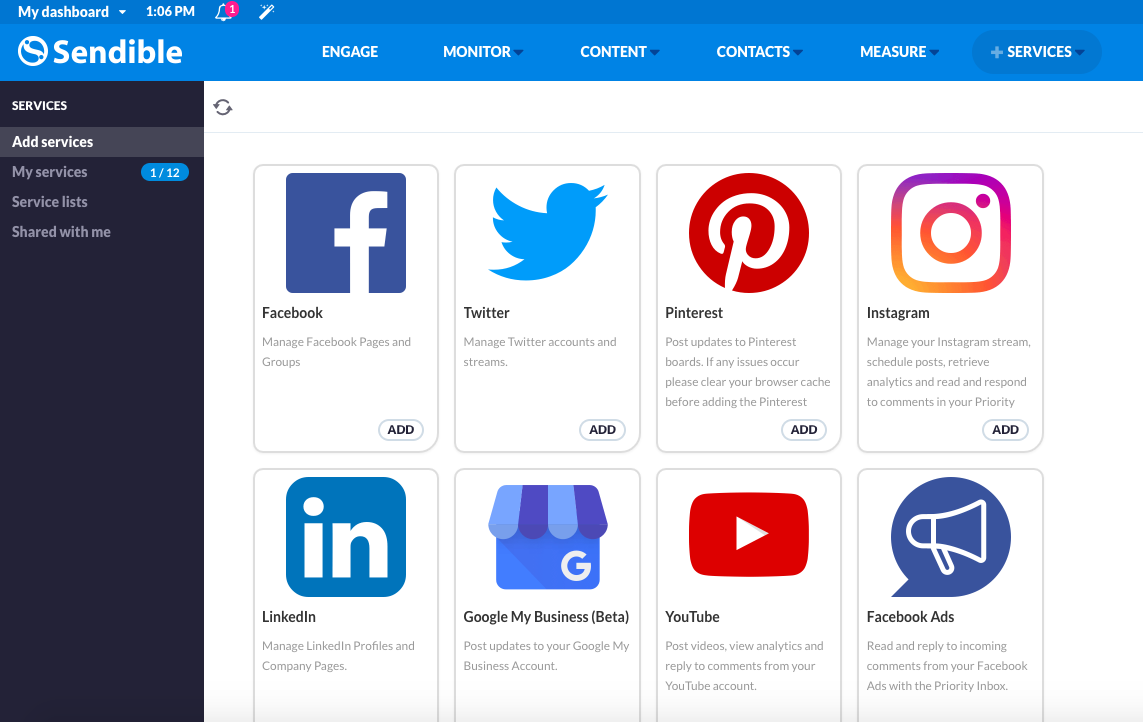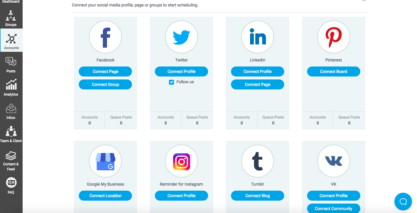 Sendible is a social media tool designed for agencies. They support Facebook, Twitter, Instagram, LinkedIn, Google+, and Google Business Profiles.