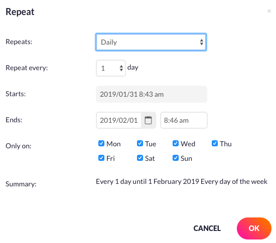With Sendible, you can schedule your post to repeat with a lot of options for how it will repeat, such as only on specific days of the week.