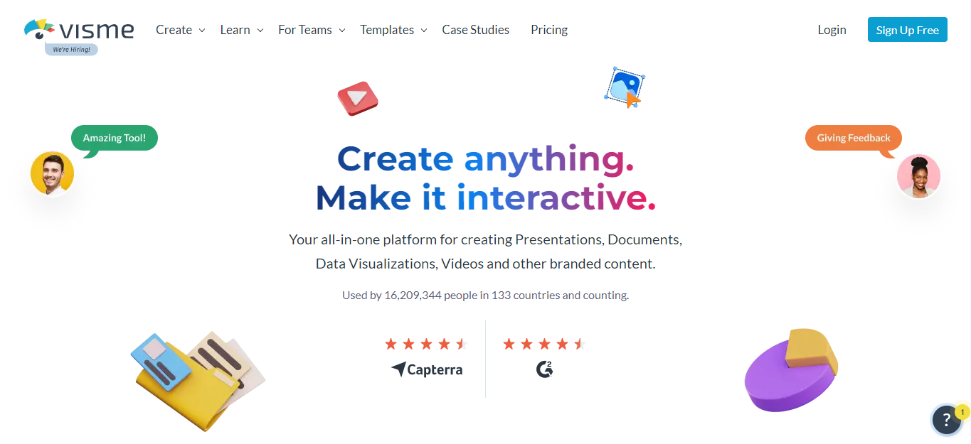 Visme is not simply a video creation tool, but it’s a complete workshop for the creation of multiple types of content. With simple usage functionalities, Visme helps you create the most amazing customer testimonial videos.