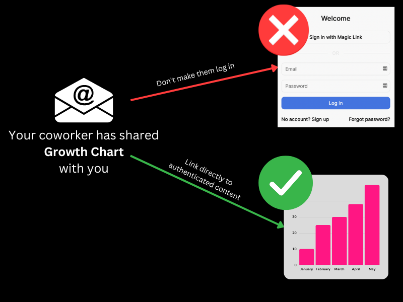 This comes with some nice benefits, for example, you don’t need a separate sign up and login page and your users don’t need to remember a password to log in. However, past the obvious use case of logging users in, magic links can also be used in other areas of your product to provide a more seamless experience.