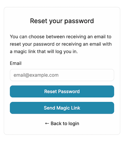 In PropelAuth, we host authentication UIs for our customers. If they enable both password and magic link support, we automatically provide both options on the Reset Password screen so your users can choose which option they prefer. Most commonly, users choose magic links over resetting their password.