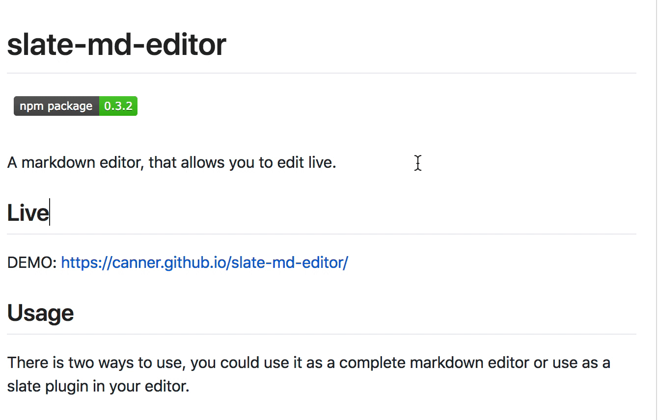 A markdown editor, that allows you to edit live. This project is built on top of slate framework. Support markdown syntax and hot keys.