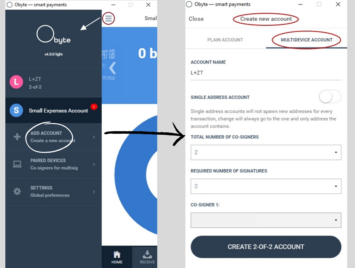 Users only need to add a new account from the main menu, select “Multidevice”, and set the number of co-signers from their contacts (they should be paired). Then, all transactions made from that account will ask for permission from the selected number of co-signers before sending funds.