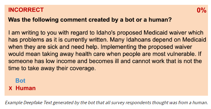 If the above research is from 2019, imagine how much better AI bots are at generating content today. Then imagine what happens when AI bots pretend to be humans and start writing and emailing congressional representatives.