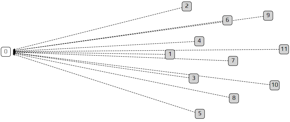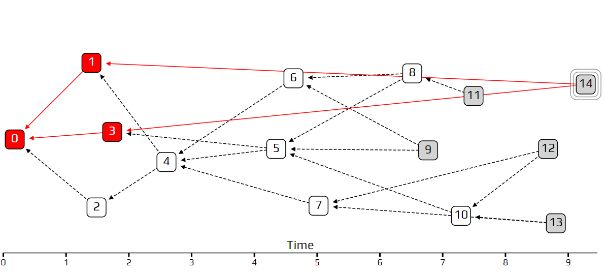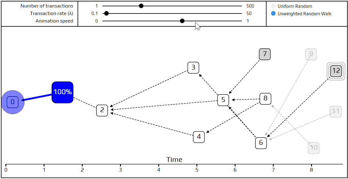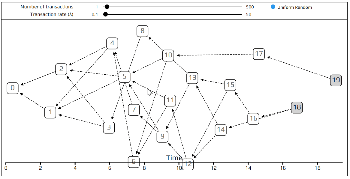 In previous simulation, you may have noticed that transactions are not evenly spread out across time, but some periods are “busier” than others. This randomness, which makes the model more realistic, is achieved by using a Poisson point process to model how transactions arrive. This model is very common for analyzing how many customers walk into a store in a given time period, or how many phone calls are made to a call center. We can see this behavior in example tangle below. Transactions 4, 5, and 6 arrived almost simultaneously, and after transaction 6 there was a long pause.
