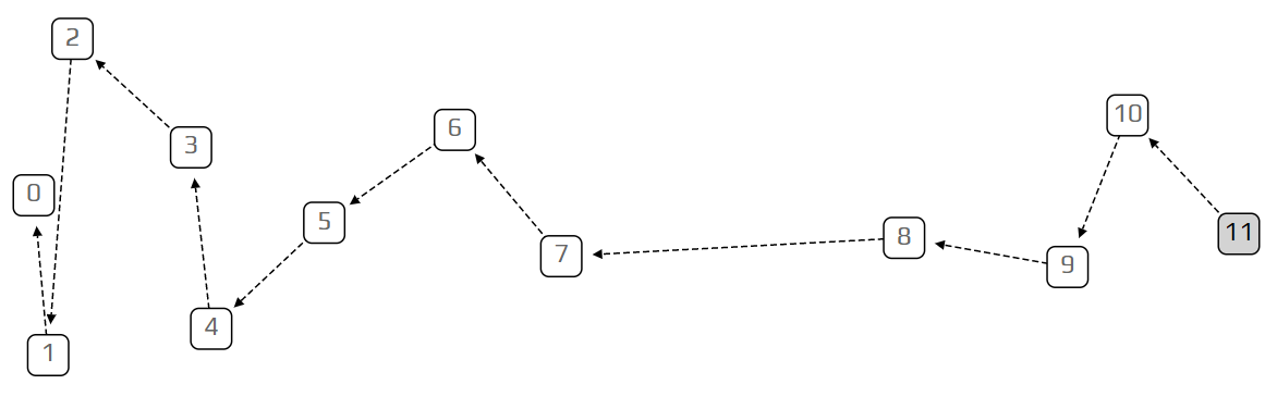 So what do we mean by the transaction not “seeing” a previous one? In the model, we make each transaction invisible for a certain period after it arrives. We mark this delay period with the letter h. This delay represents the time it takes for the transaction to be prepared and propagate through the network. In our simulation, we always set h=1. This means we can only approve transactions that are at least one time unit in the past. This delay is not just a minor detail that was put in for extra realism, but a fundamental property of the tangle, without which we will always get a very boring chain. It also brings the tangle closer to the real world, where it takes some time for people to tell each other about new transactions.