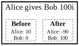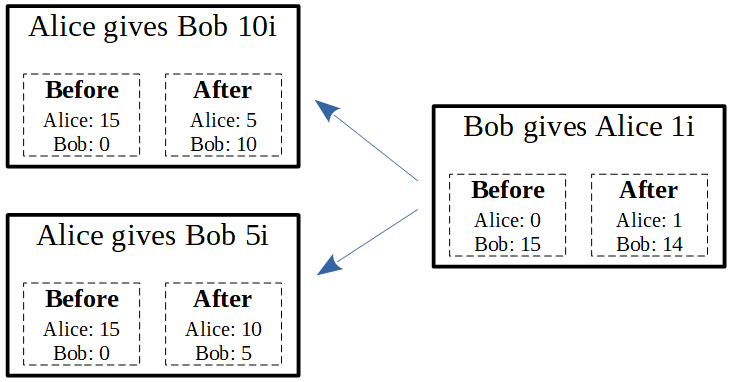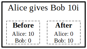 Coming back to Alice and Bob, let’s look at a simple example. The box represents a transaction. For convenience, we also write down the balances in Alice and Bob’s accounts before and after the transaction took place. We see that in the beginning Alice had 10i, which she gave to Bob, after which Bob has 10i and Alice has nothing.
