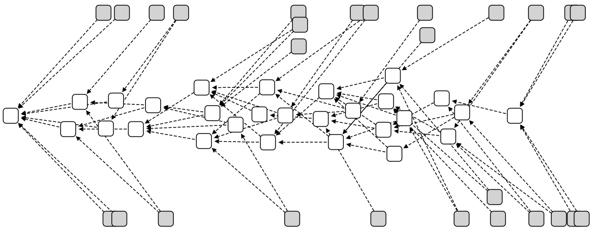 To see what the tangle looks like when everyone uses this random selection strategy (technically called “uniform random tip selection”), you can play with this visual simulation of it. This simulation generates random tangles, with the very first transaction (called the genesis) on the left and the most recent transactions on the right. The tips are marked with a gray square. When you put your mouse over a transaction, all the transactions approved by it are highlighted in red, and all those which approve it turn blue.
