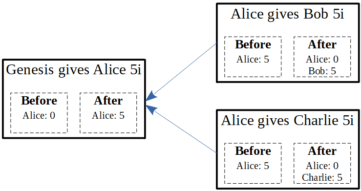 As you can see, Alice has 5i, which she gives to both Charlie and Bob. This is clearly a problem: we cannot treat both these transactions as valid. Using Tangle terminology, we cannot have a future transaction approving both of them, since it will end up with a negative balance in Alice’s account.