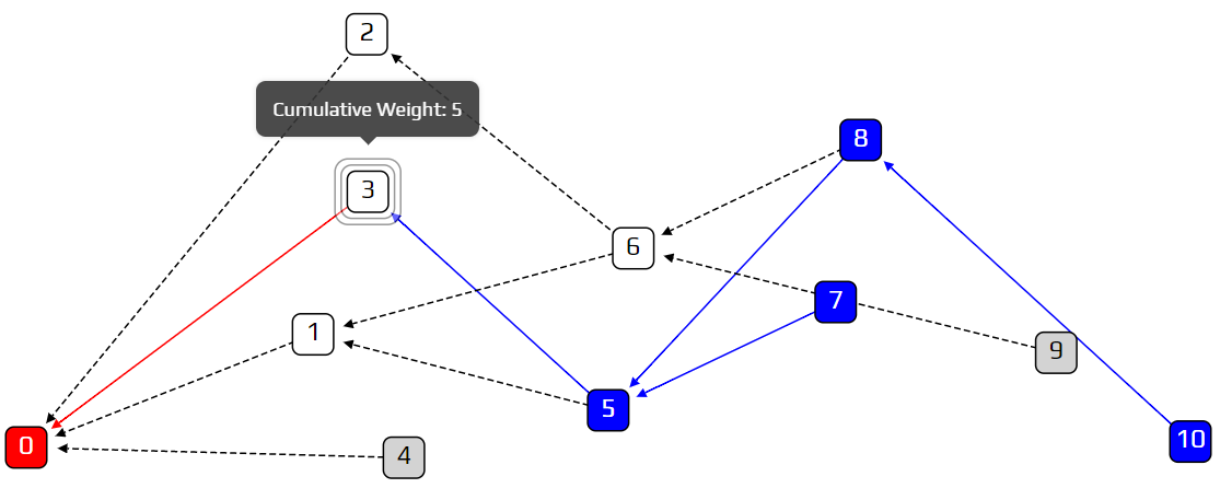 Our strategy will be to bias our random walk, so we are less likely to choose lazy tips. We will use the term cumulative weight to denote how important a transaction is. We are more likely to walk towards a heavy transaction than a light one. The definition of cumulative weight is very simple: we count how many approvers a transaction has, and add one. We count both direct and indirect approvers. In the example below, transaction 3 has a cumulative weight of five, because it has four transactions which approve it (5 directly; 7, 8, and 10 indirectly).