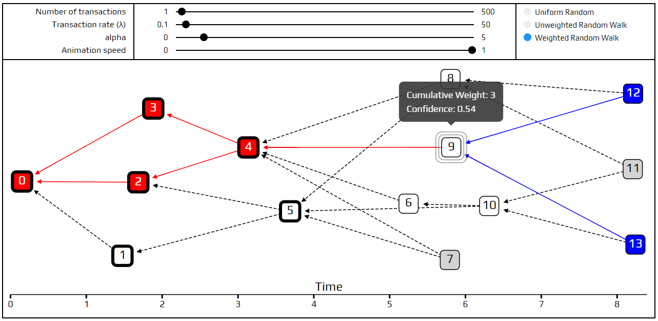 You can see the path the walker follows is marked in red, and at each junction the different possible paths are marked in blue. Very recent transactions, which are “invisible” to the current random walk, are shown as transparent.