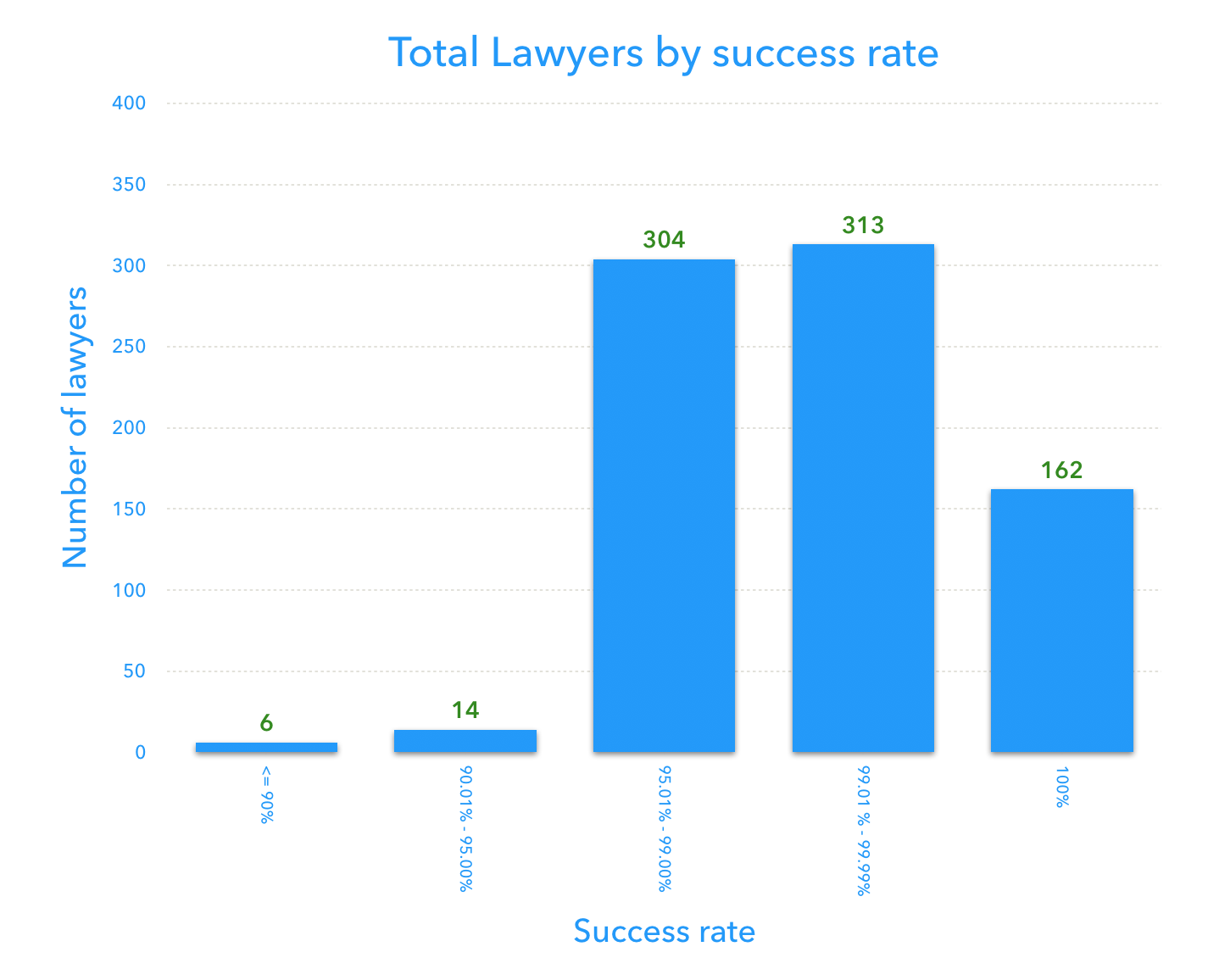 The graph below total lawyers by their success rate (for lawyers with 100 or more cases filed in 2015):