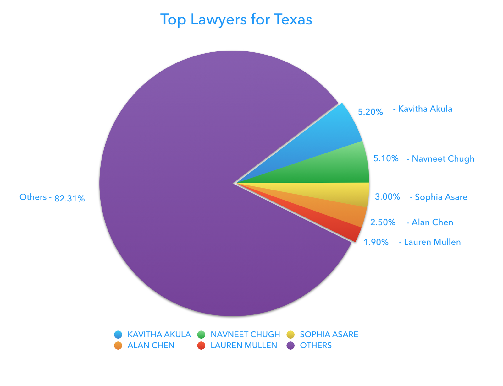 The top lawyers in Texas have a higher proportion of total cases filed. They top lawyer has a share of 5.20%. It could be because a smaller number of total lawyers filed for visas. Only 1,605 lawyers filed H-1B cases in 2015. The top 5 lawyers filed for about 17.60% of the total cases.