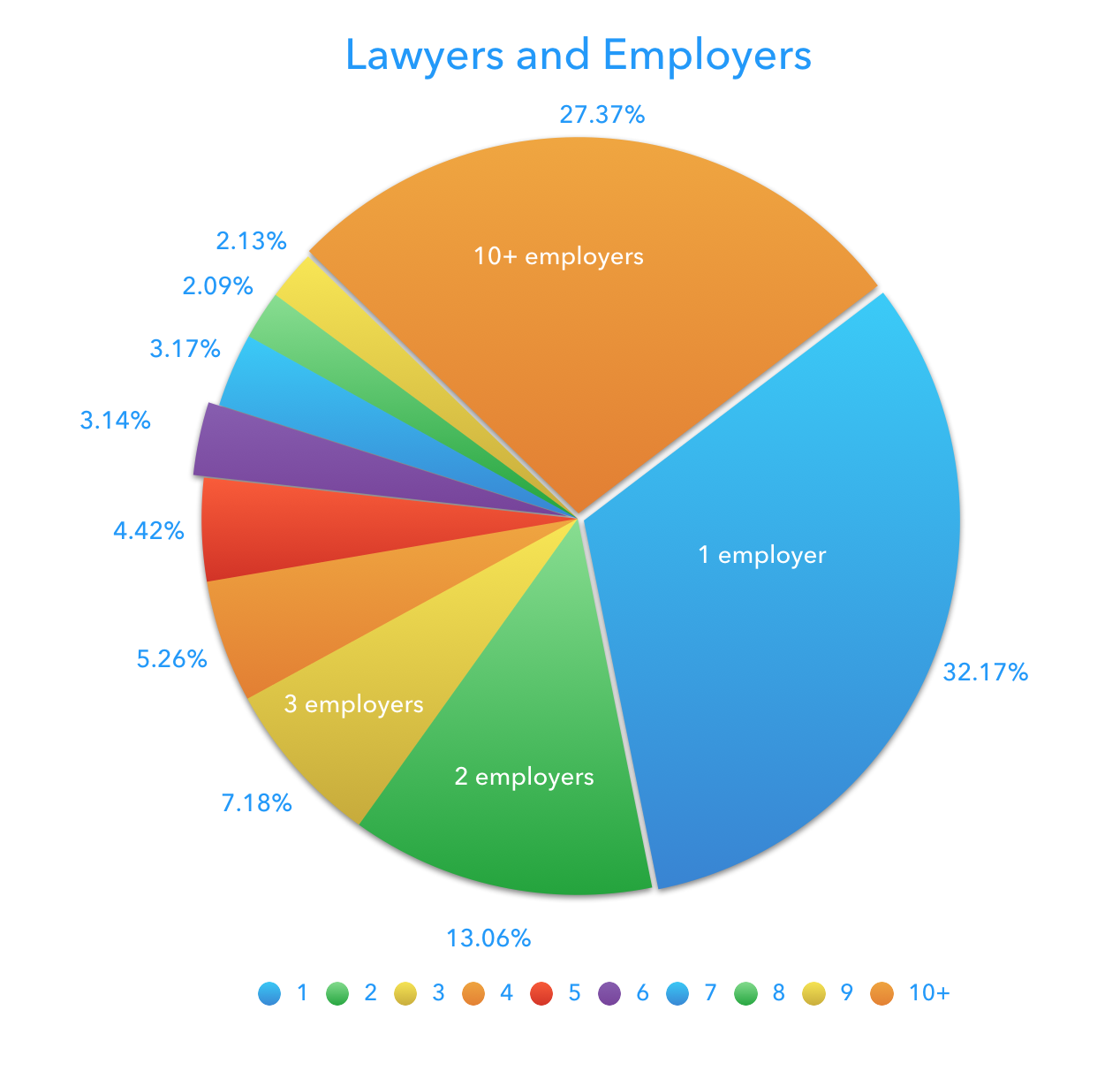 The graph below shows that a huge percentage of lawyers work with a small number of employers. They are probably on long term contracts and employers don’t want to change lawyers as it is both expensive and time consuming.