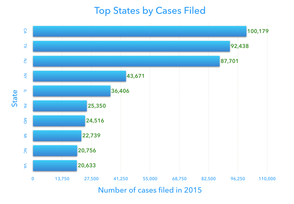 Below are the top 10 states by number of cases filed with USCIS in 2015. The top three states are far ahead of the others in number of total applications. The 4th state on the list has less than 50% of the applications filed in state at the 3rd position.