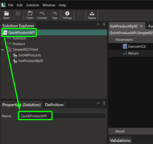15. Rename the solution to QuickProductAPI. Do this by clicking on the solution in the solution explorer and then changing the name property then saving the solution. This is important because it will reflect as such on the Linx Server. Renaming it will make the solution easier to identify when you have more than one solution deployed.