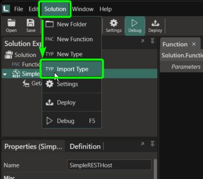 4. To create the events that will act as endpoints, you first need to make the custom type that will be returned. This custom type will be returned as a JSON object when the endpoint is called. To create this custom type click on the Solution ribbon, and click on the Import Type option.