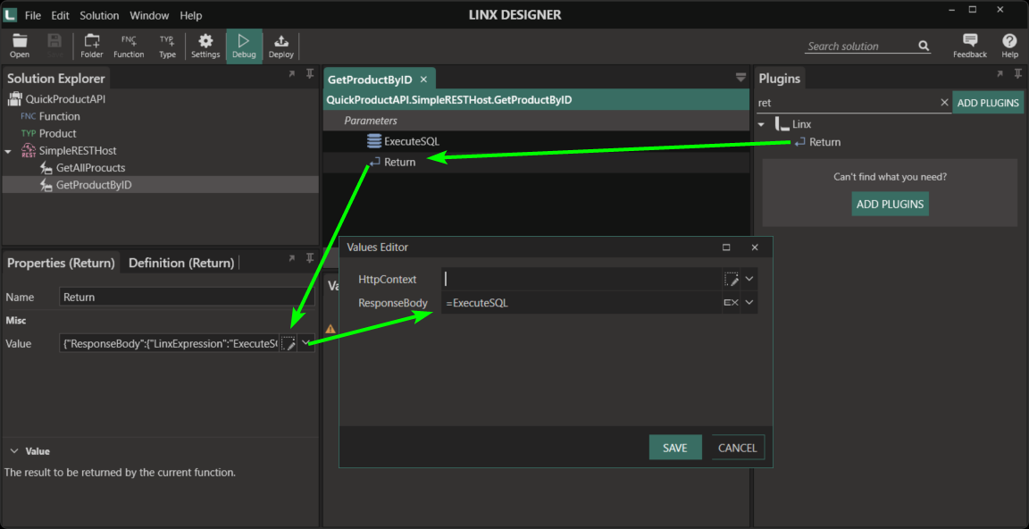 v. Add a Return function to the event that will set the response body to the ExecuteSQL result. To do this, click on the edit button for the Value, then in the ResponseBody section, select ‘ExecuteSQL’ (the result of the SQL query from the function). Save the solution.