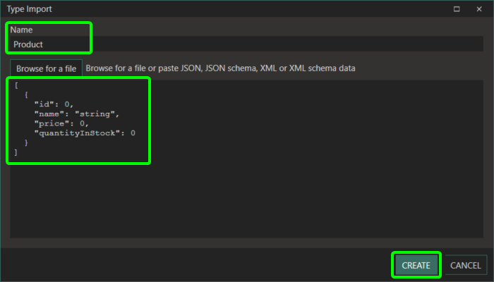 Paste the below JSON into the dialogue box. Name the type of Product then click the create button