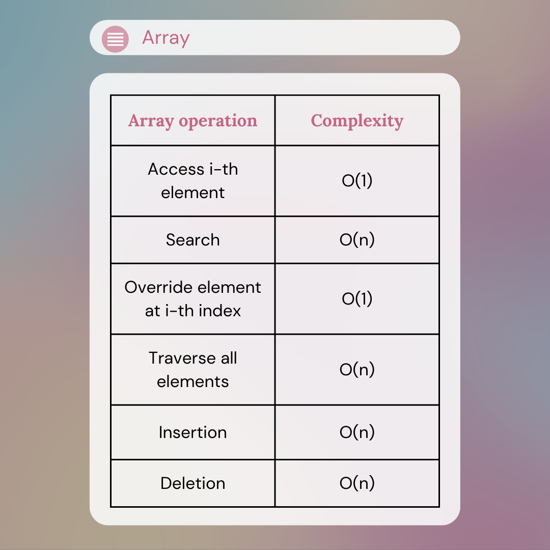 Insertion O(n) - Linear Time: Order matters in an array so if you insert an element in any index that isn't the last index you will have to shift the indexes after and increase their index number by 1. The act of shifting the indexes increases the time complexity to O(n) items needing to be shifted.