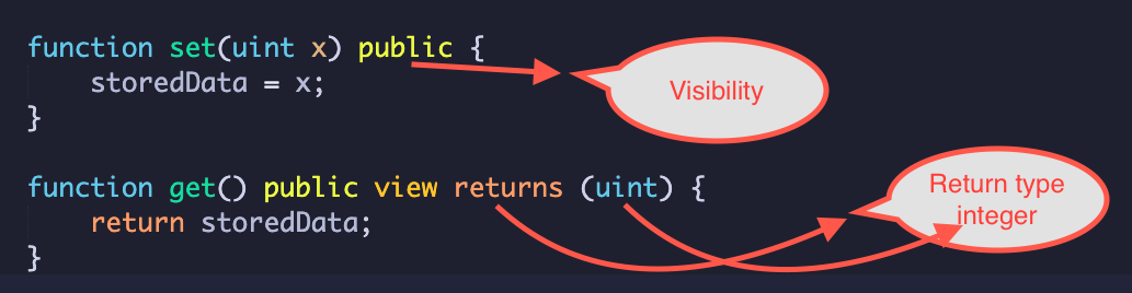 As you may have noticed, functions in Solidity are structured a bit differently than in Typescript. The visibility of the function is specified after the name. This is followed by the return type. Have you noticed the view right before the return type definition? This is not necessary. view ensures that this function is a read-only function, which ensures that state variables cannot be modified after calling them. Getters are normally view functions. A public function can be called outside of the smart contract. So another Smart Contract could call our set() function here. If you want to reduce the scope of the contract, use the internal keyword.