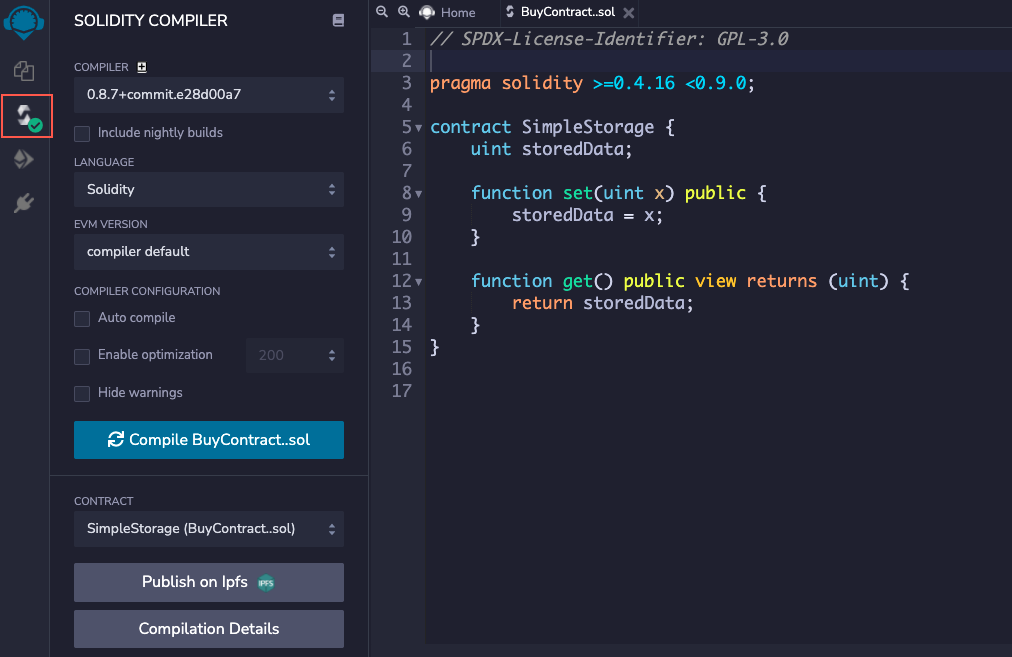 You don't need to adjust any options here. Just click "Compile BuyContract.sol" and it's getting compiled. After this is finished, head over to the deploy section.