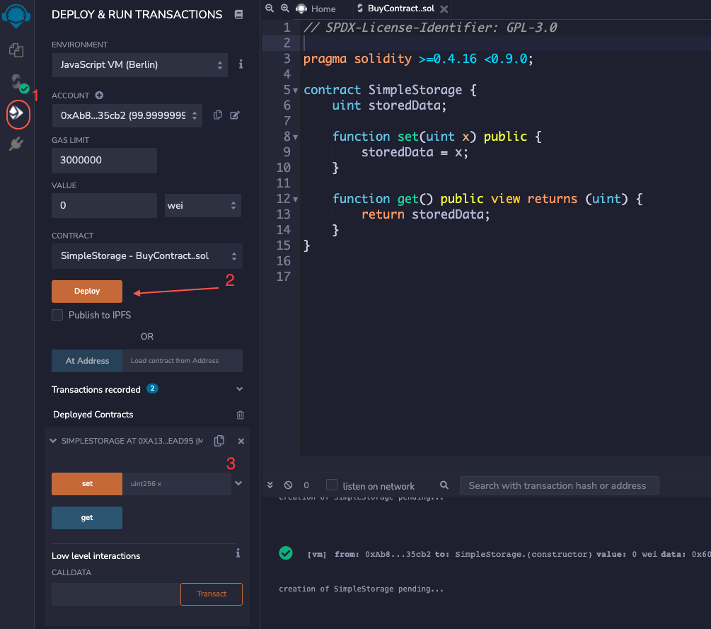 Click on the deploy tab on the left side. Under Environment choose the JavaScriptVM (Berlin) or (London). You can leave the rest of the options as they are. Chose your Contract and then press Deploy (marked as 2 in the picture). This will take a while but when it's ready you should see the SimpleStorage Contract beneath the Deployed Contracts. Here we have access to our get and set functions. Use the input fields (3) and play a little bit around.