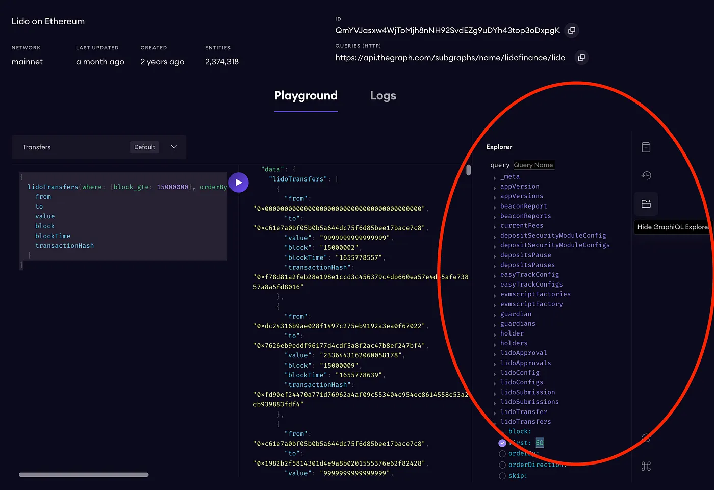 lidoTransfers(orderBy: block, orderDirection: asc, first: 1) {