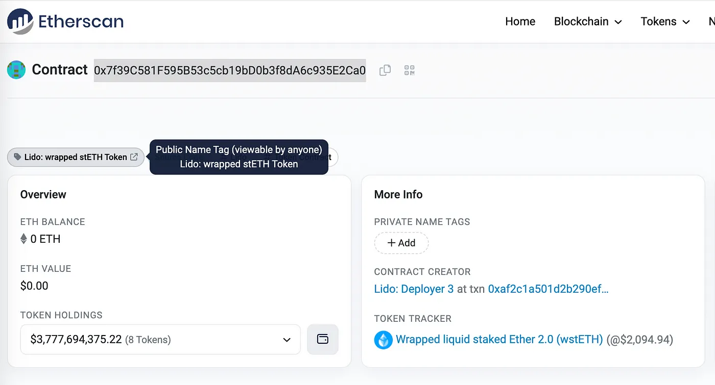 The address “0x7f39c581f595b53c5cb19bd0b3f8da6c935e2ca0” can be found on the Etherscan as Lido: wrapped stETH Token.