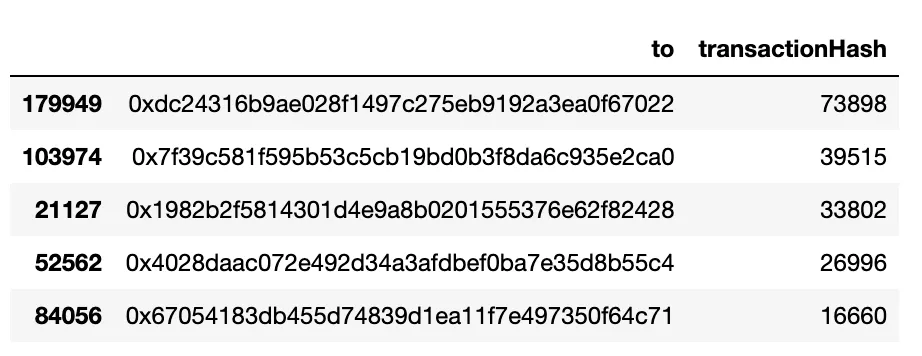 Also, it is interesting to check the most frequent receiver of funds (by the field called “to”):