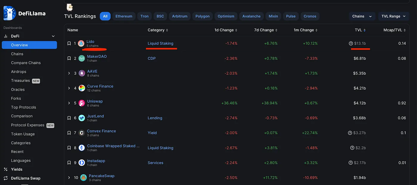 Lido protocol is currently top-1 in terms of TVL (Total Value Locked — a metric used to measure the total value of digital assets that are locked or staked in a particular DeFi platform or DApp) according to DeFiLlama.