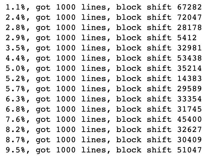 print(f"{(offset-first_block)/(current_last_block - first_block)* 100:.1f}%, got {len(sub_result)} lines, block shift {sh}" ) #show the log