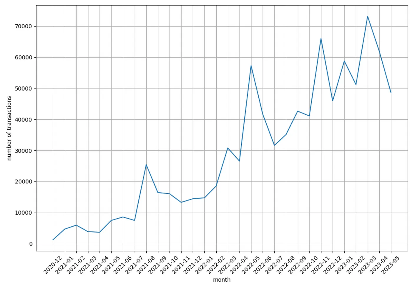 The number of transactions per month is growing over the years constantly!