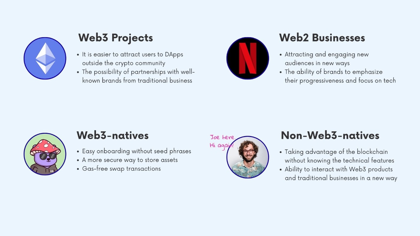 - Onboarding non-Web3 users to Web3 seamlessly;