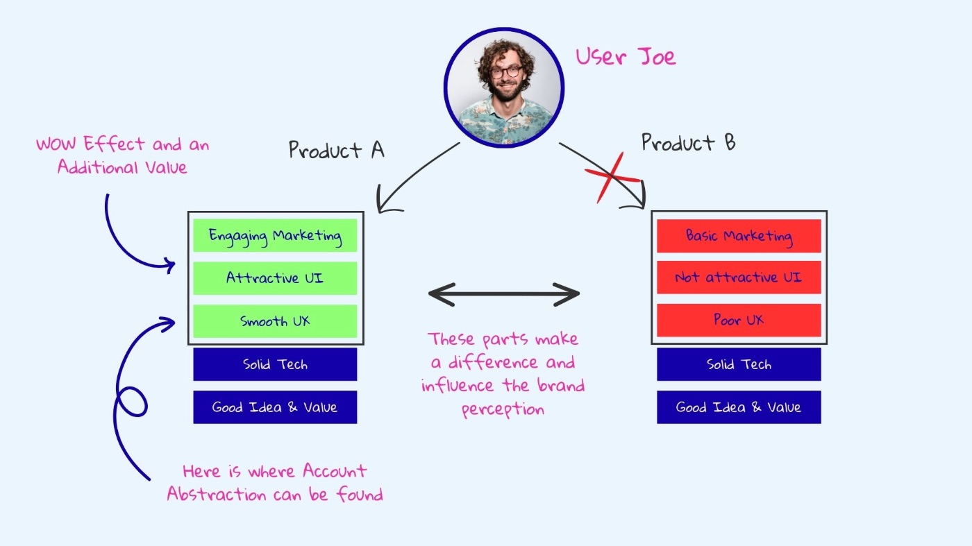UX, UI, and marketing make a difference and influence the brand perception. Of course, Joe wants to use Product A because it not only gives him answers to his questions but also interacts with him and opens new frontiers of brand experience, including the help of Account Abstraction.