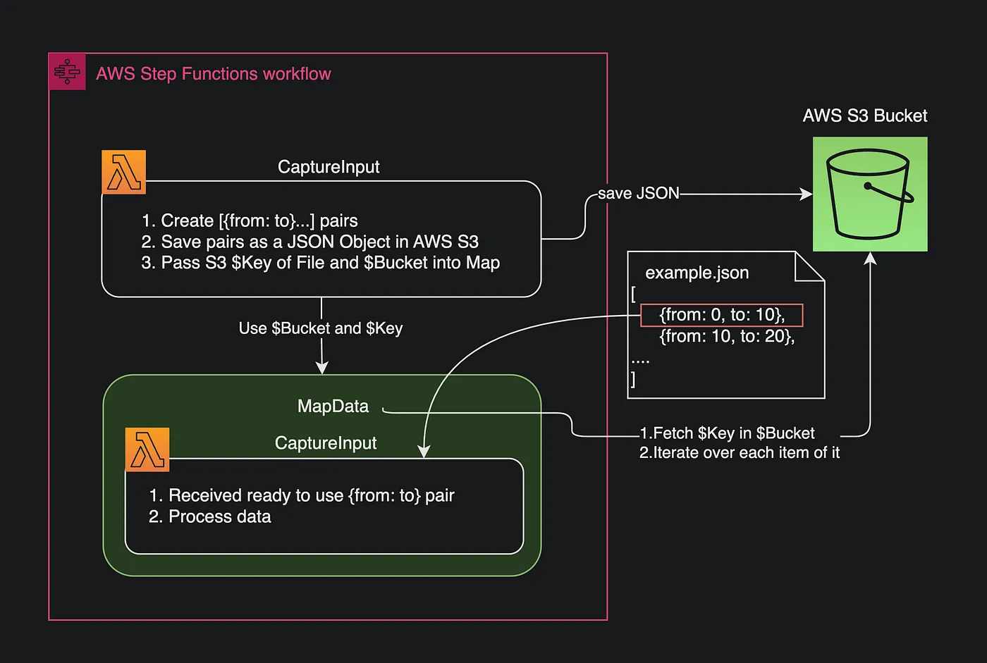 We just save the from-to[] payload into an s3 file and pass bucket and path to the Map State. Now we need to consume it!