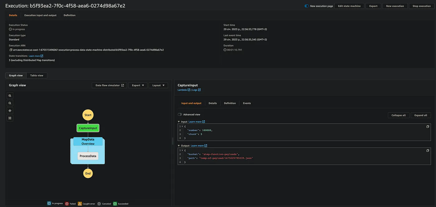 The output of CaptureInput is bigger than the step function can process (256 KB). Even if we try somehow to optimize params passing we still can hit 25k execution events when we would need to add other steps into the MapData task. And that is the time for Distributed Map to rescue us!