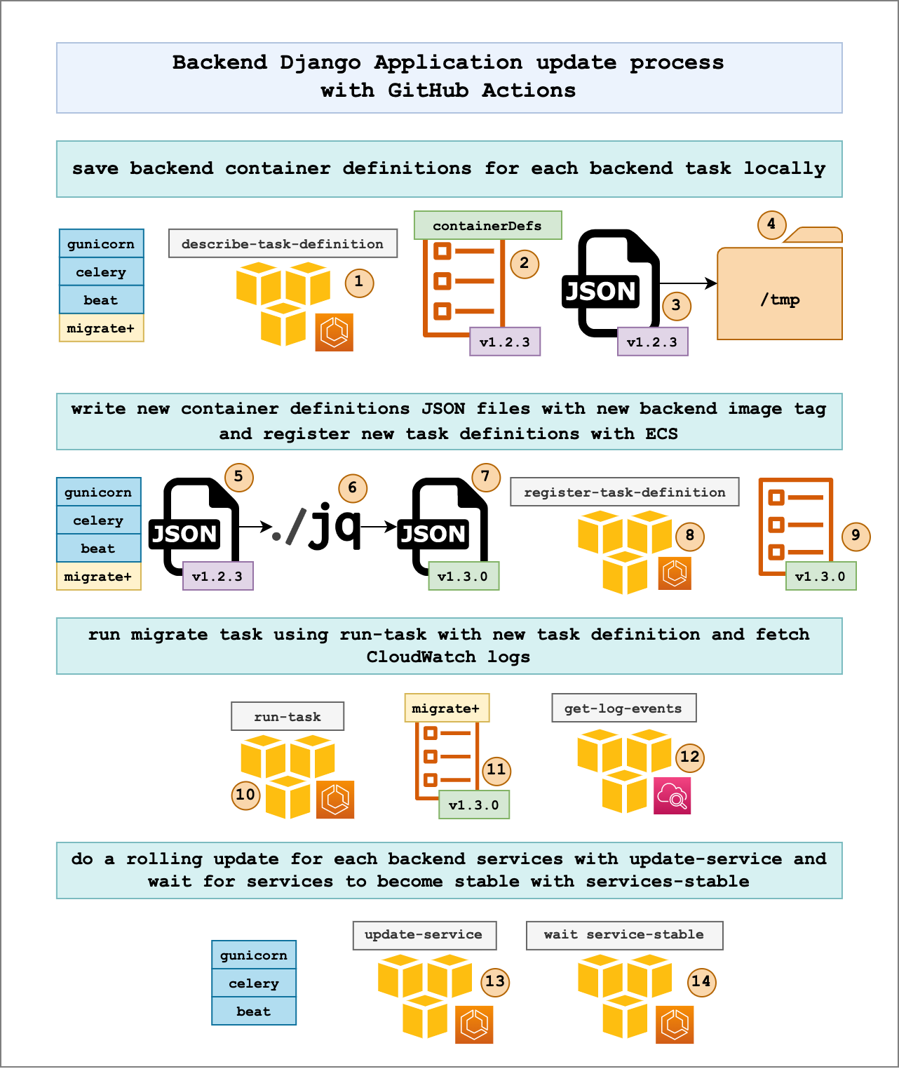 The process described above is needed for updating the backend application. Updating the frontend application involves a similar process to the backend update. The main difference is that no task (such as the migrate command on the backend) needs to run before the service is updated. Here's an overview of the frontend update process: