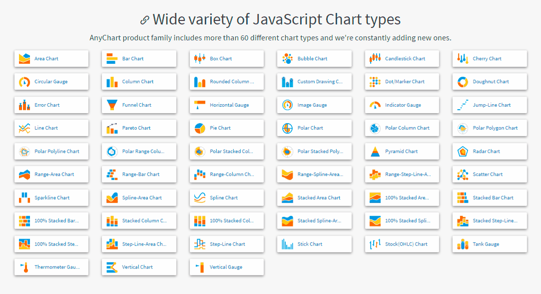 Currently we market AnyChart JS Charts as a product family consisting of smaller, purpose-specific JavaScript charting libraries: AnyChart for basic charts, AnyStock for date/time based visualizations including but not limited to stock and financial graphics, AnyMap for geo maps and seat maps, and AnyGantt for project Gantt, resource, and PERT charts. But essentially it’s one universal data visualization tool based on our own award-winning open-source GraphicsJS library.