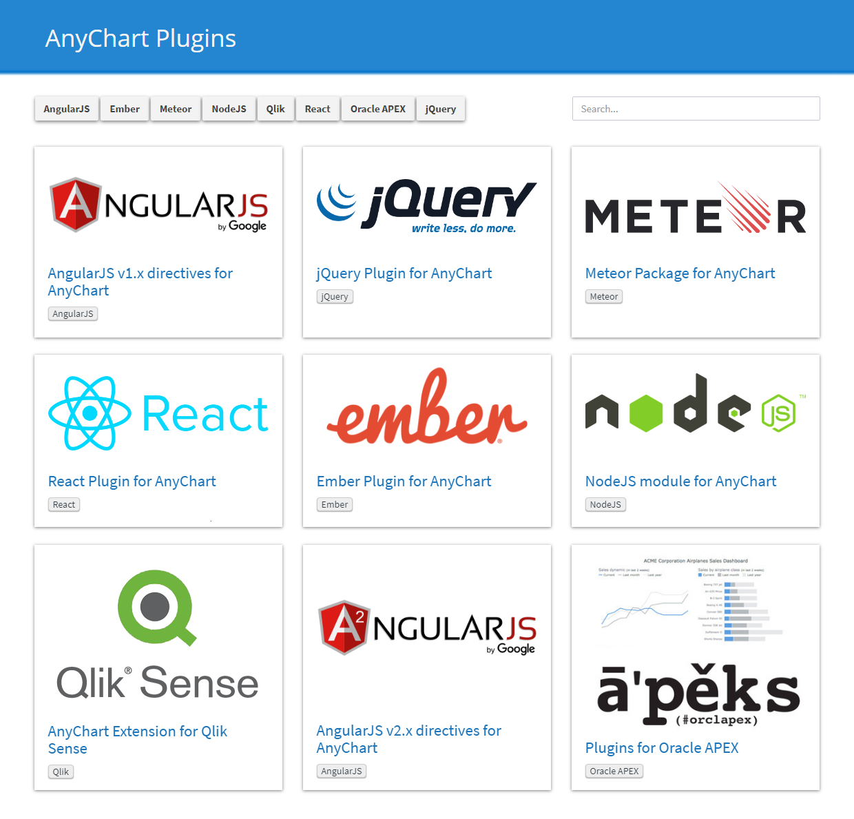 Here I would mention AnyChart plugins for Oracle APEX, Qlik Sense, Angular, Ember.js, jQuery, Meteor, Node.js and React. Basically, all these have been very impactful and made many users of the corresponding solutions our customers as well.