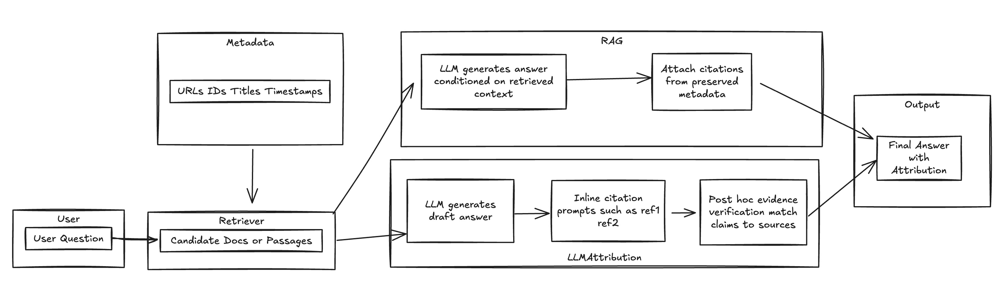 - Easier: The retrieval step already produces references (URLs, IDs, snippets). If you preserve these through generation, you naturally have candidates for attribution.